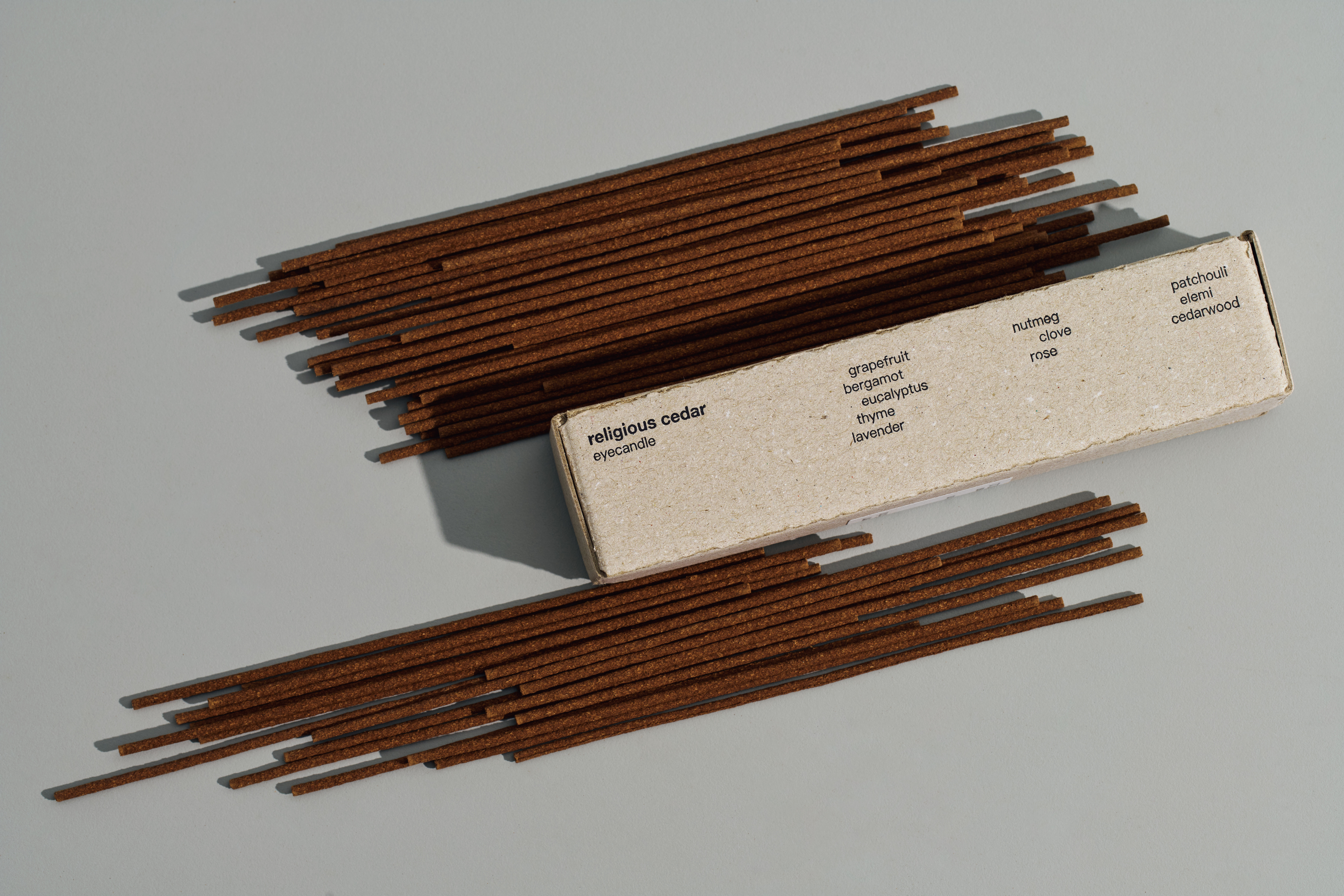 線香採用油脂含量高、香氣濃郁且留香持久的印度老山檀木,並搭配 eyecandle經典的宗教雪松。溫暖的木質調,交織著淡雅的花香與草本氣息,香氣層次豐富、餘韻悠長